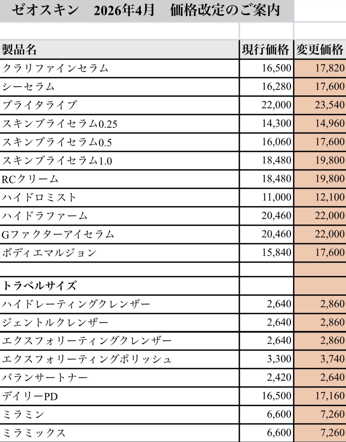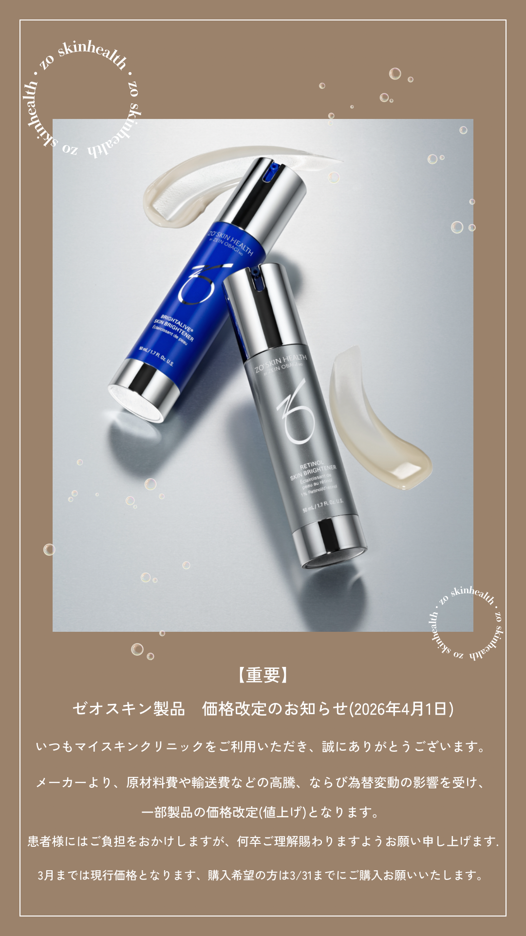 2026.03.03お知らせ~ゼオスキン価格改定のお知らせ~いつもマイスキンクリニックをご愛顧いただき誠にありがとうございます。ゼオスキンの価格改定のお知らせです。メーカーの仕入れ値の変更に伴い、2026年4月1日より値上げとなっております。ご理解の程、よろしくお願い申し上げます。ご愛用中の方やご興味のある方は、どうぞお早めにお買い求めください。Screenshot